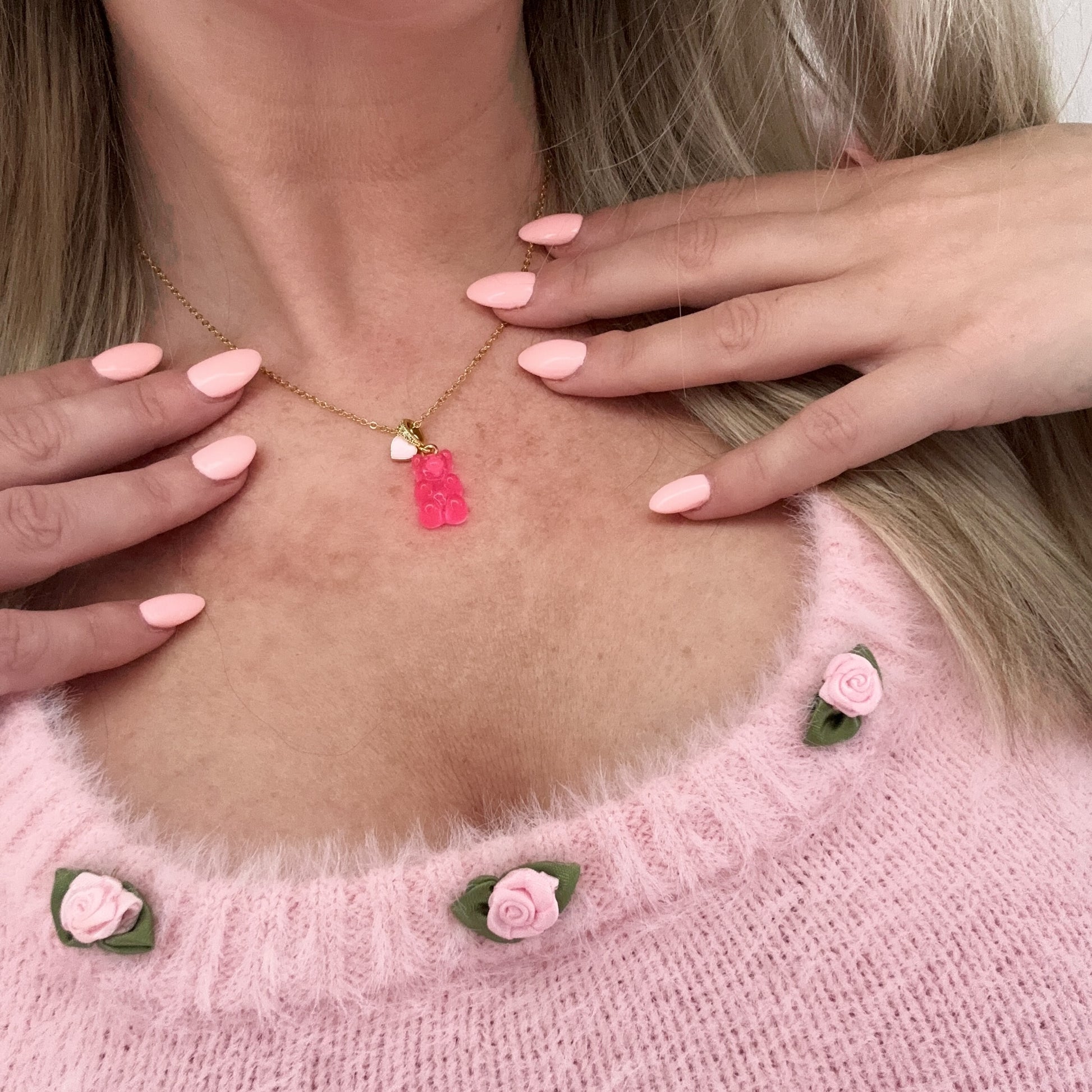 On Wednesdays, we wear pink! This bright and colorful Signature Jelly Bear necklace was hand crafted and designed with heart - literally.
